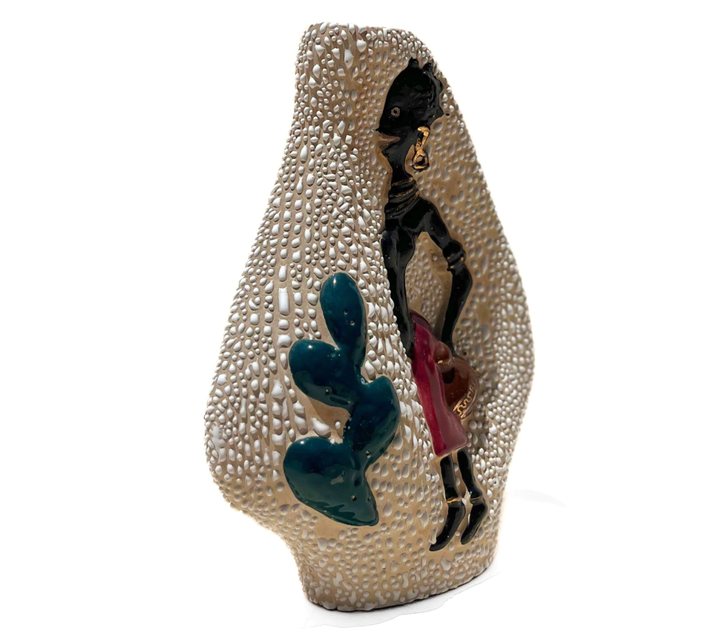 A peça traz figuras africanas estilizadas em alto-relevo, modeladas e pintadas à mão, com detalhes como brincos, saias coloridas, utensílios e elementos vegetais na lateral. As formas assimétricas e o trabalho manual reforçam o caráter decorativo e expressivo típico das produções artesanais do período.