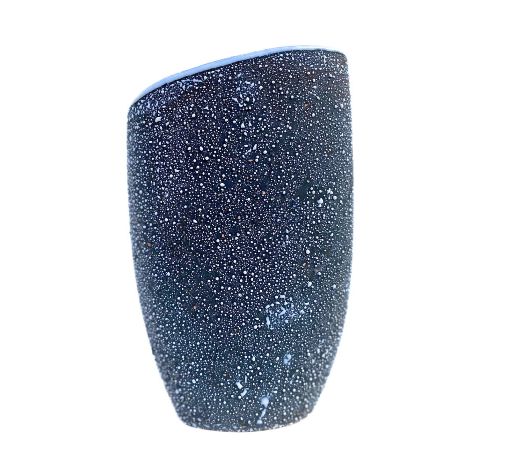 Vaso em cerâmica com acabamento pingo de leite, caracterizado pela superfície densamente salpicada em relevo, que cria textura e profundidade visual. A peça apresenta forma orgânica e assimétrica, com recorte superior inclinado, evocando a linguagem do modernismo brasileiro.